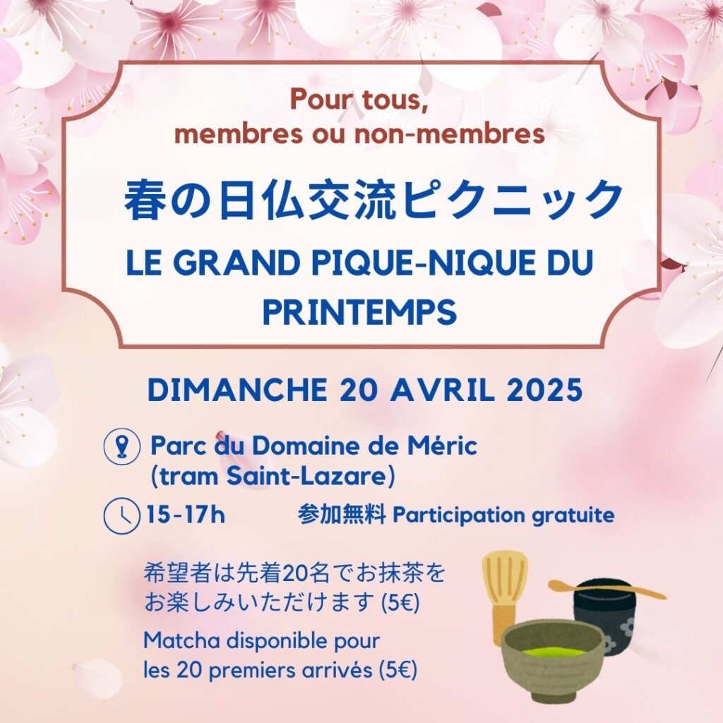 Nous, l’association des japonais à Montpellier organisera le pique-nique le dimanche 20 avril à 15h au Parc de Méric à Castelnau-le-Lez.