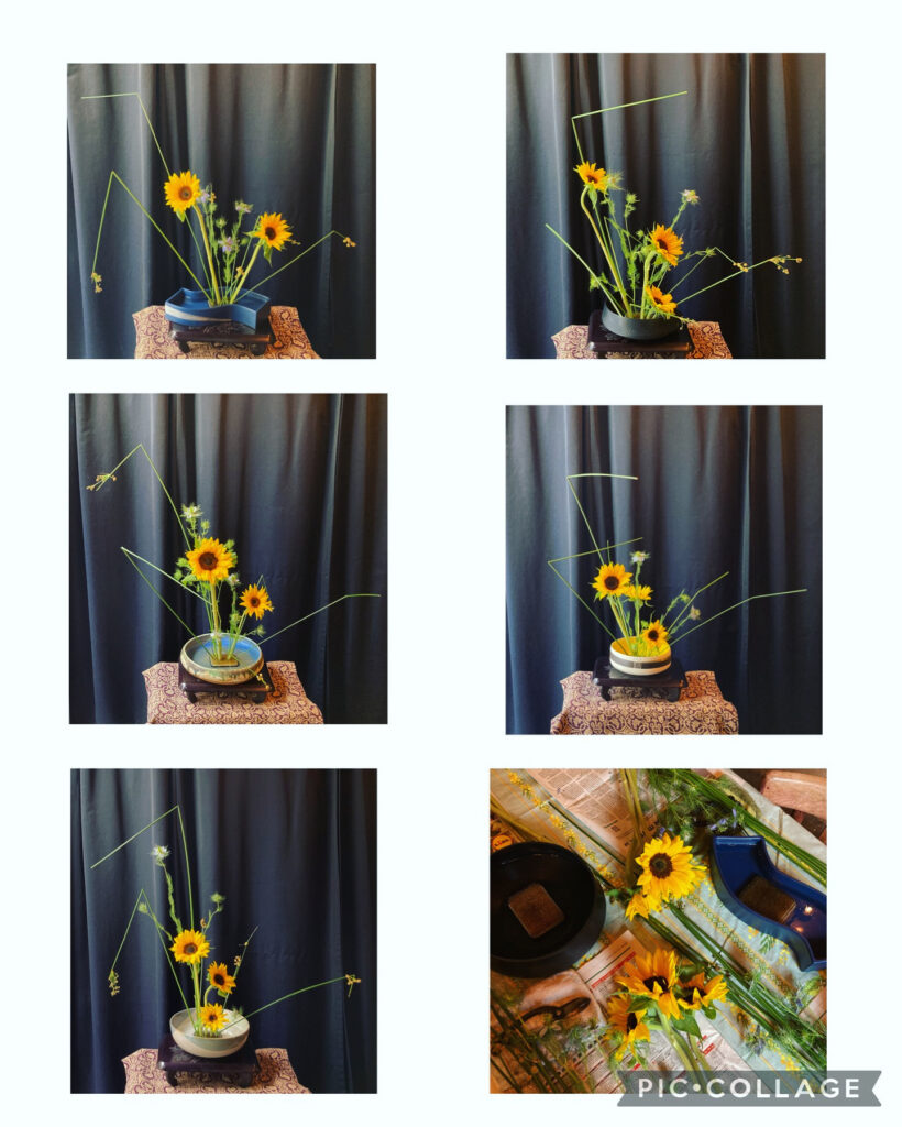 Nous avons employé des tiges de jonc afin de réaliser des compositions florales sur le thème de la saison de pluie au Japon. Les jonc pliés nous présentent le paysage naturel qui emerge après la forte pluie.