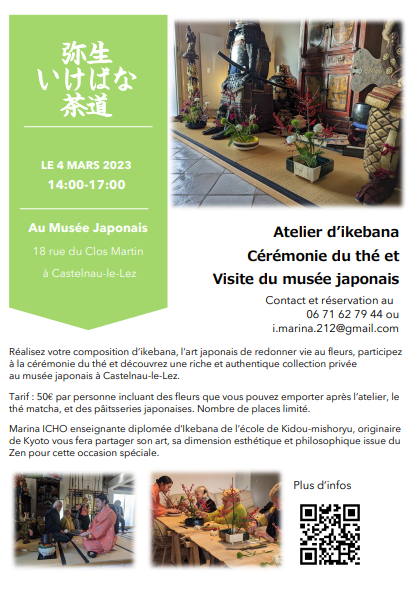 Je vais animer un atelier d’ikebana et la cérémonie du thé au musée japonais à Castelnau-le-Lez le samedi 4 mars à partir de 14h.