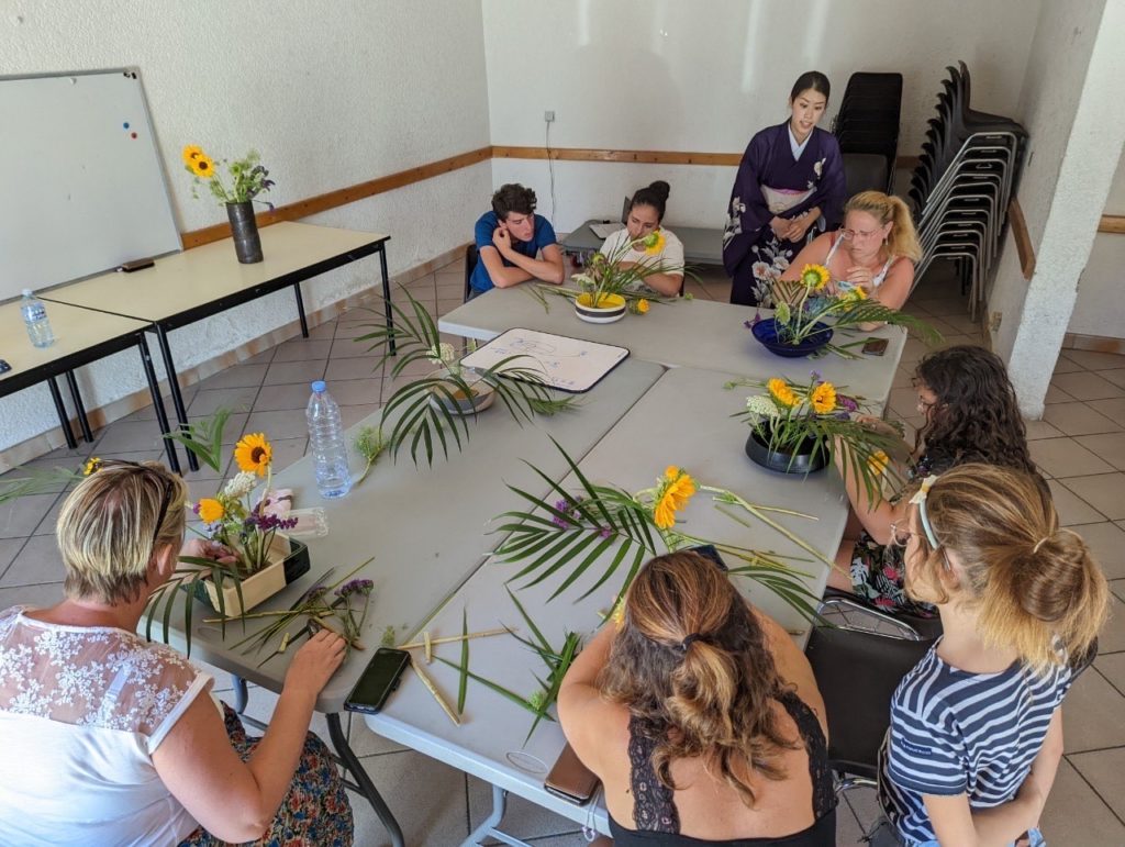 いけばな体験では、それぞれの感性で作品を仕上げて頂きました。昼下がりの暑い時間帯にも関わらず、お花と向き合って黙々と生けてくださいました。同じ花材でも異なった雰囲気の作品に仕上がり、最後は作品を並べてそれぞれの違いをお互いに享受しました。