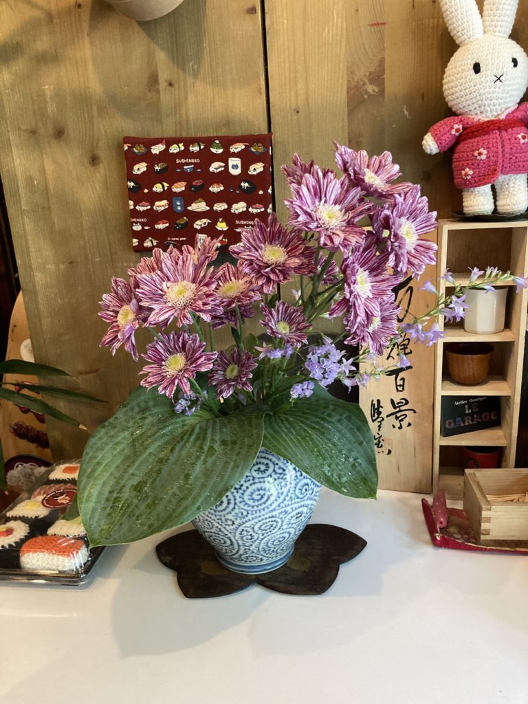 今回はそんな脇役の菊をあえて主役として扱い、不思議な花の色を楽しんで頂くために単色でシンプルなギボウシの葉をしつらえました。