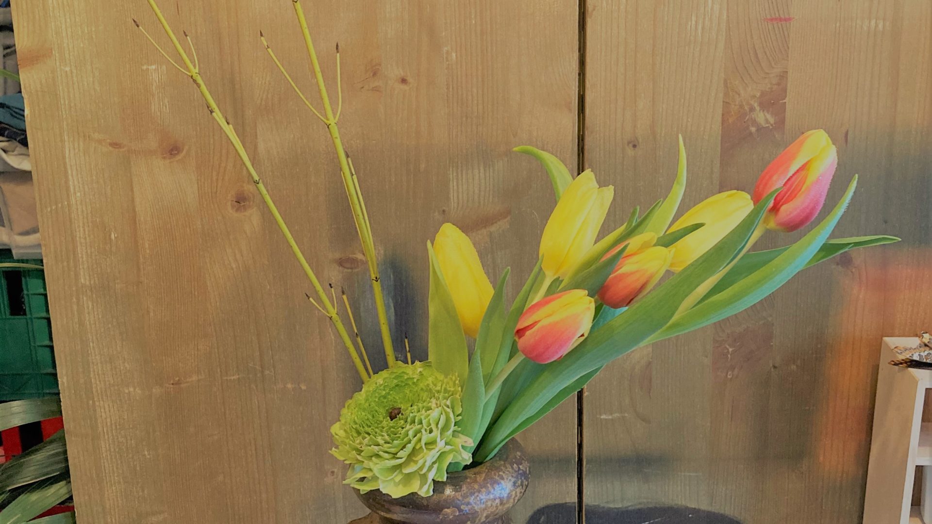Le printemps est arrivé à Montpellier. Tous les amandiers fleurissent partout dans la ville maintenant. C’est très joli. J’ai utilisé des tulipes car ce sont des fleurs connues pour annoncer l’arrivée du printemps. J’ai également utilisé une renoncule verte et des branches jaunes de cornouillers qui ont des couleurs pastel. Au contraire, j’ai choisi un