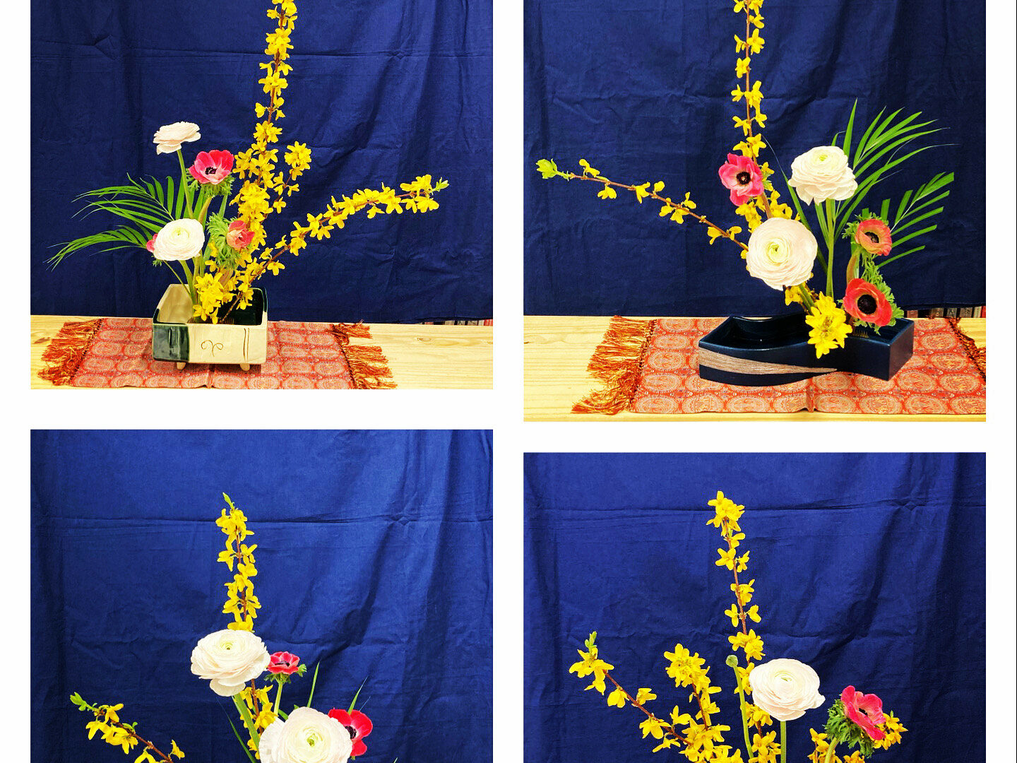 On a utilisé des branches des forsythias afin de pratiquer la forme en diagonale. Des fleurs de renoncules et anémones roses s’accordent bien avec des forsythias jaunes.
