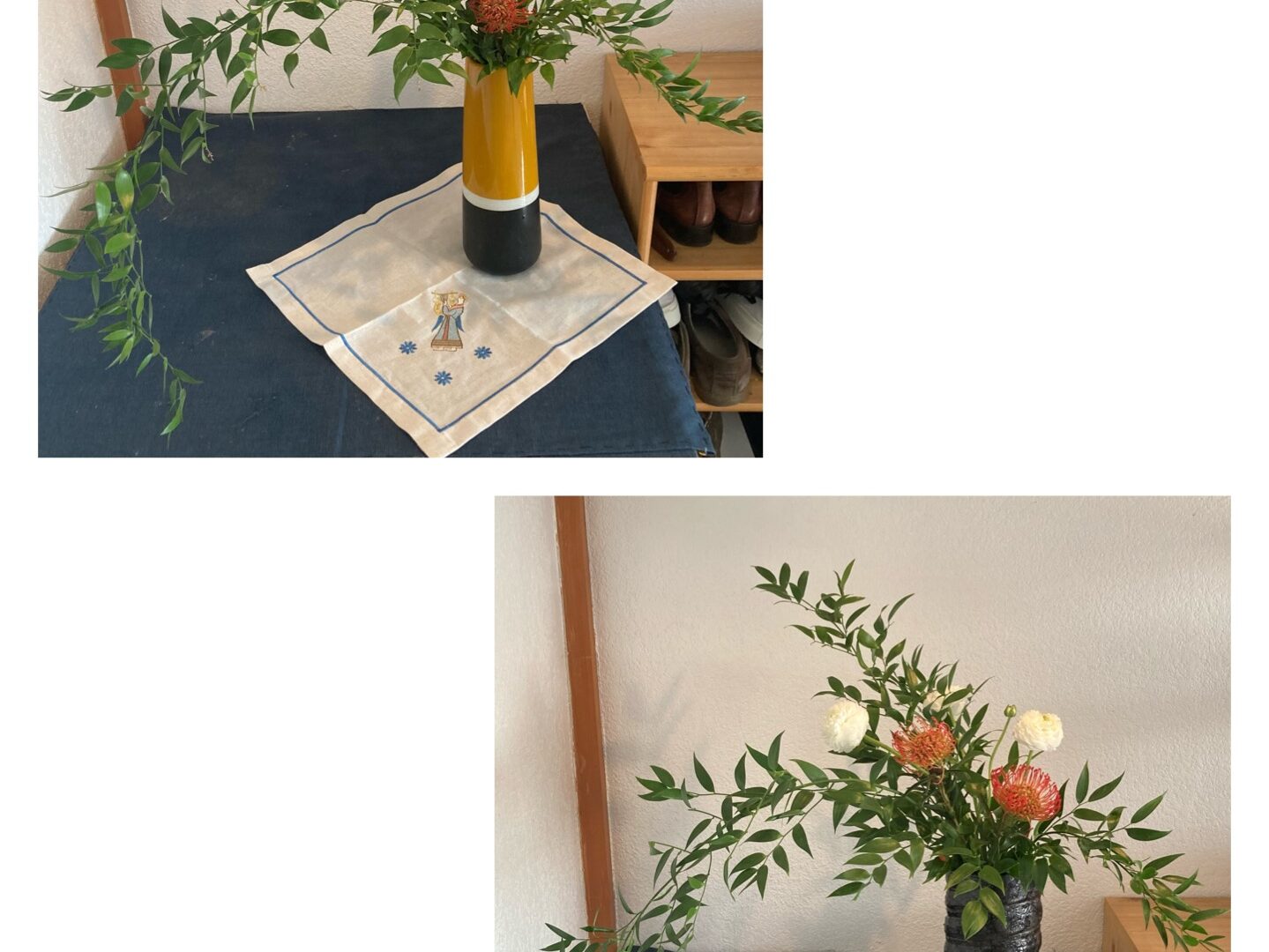 Nous avons réalisé une composition florale en utilisant des branches de Ruscus d’Italie. Les participants ont bien fléchi les branches pour changer la forme. Quant aux fleurs, on a utilisé des Nutans et des Santini.
