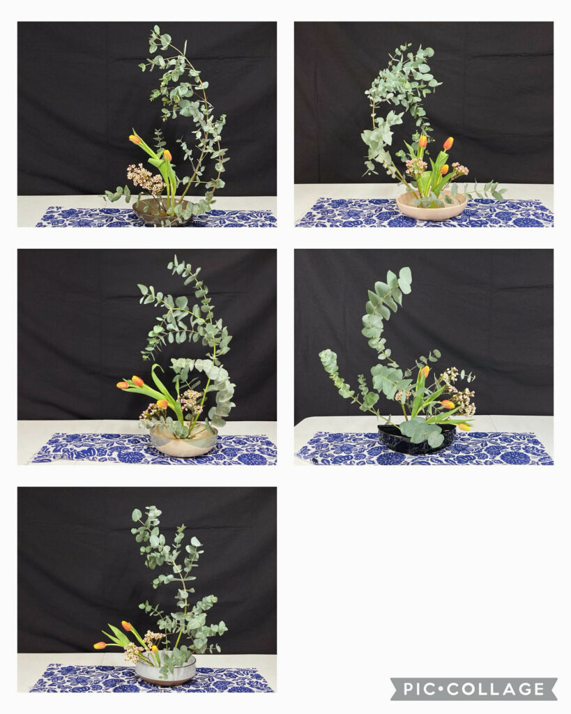 Nous avons étudié l’ikebana en employant des eucalyptus.
