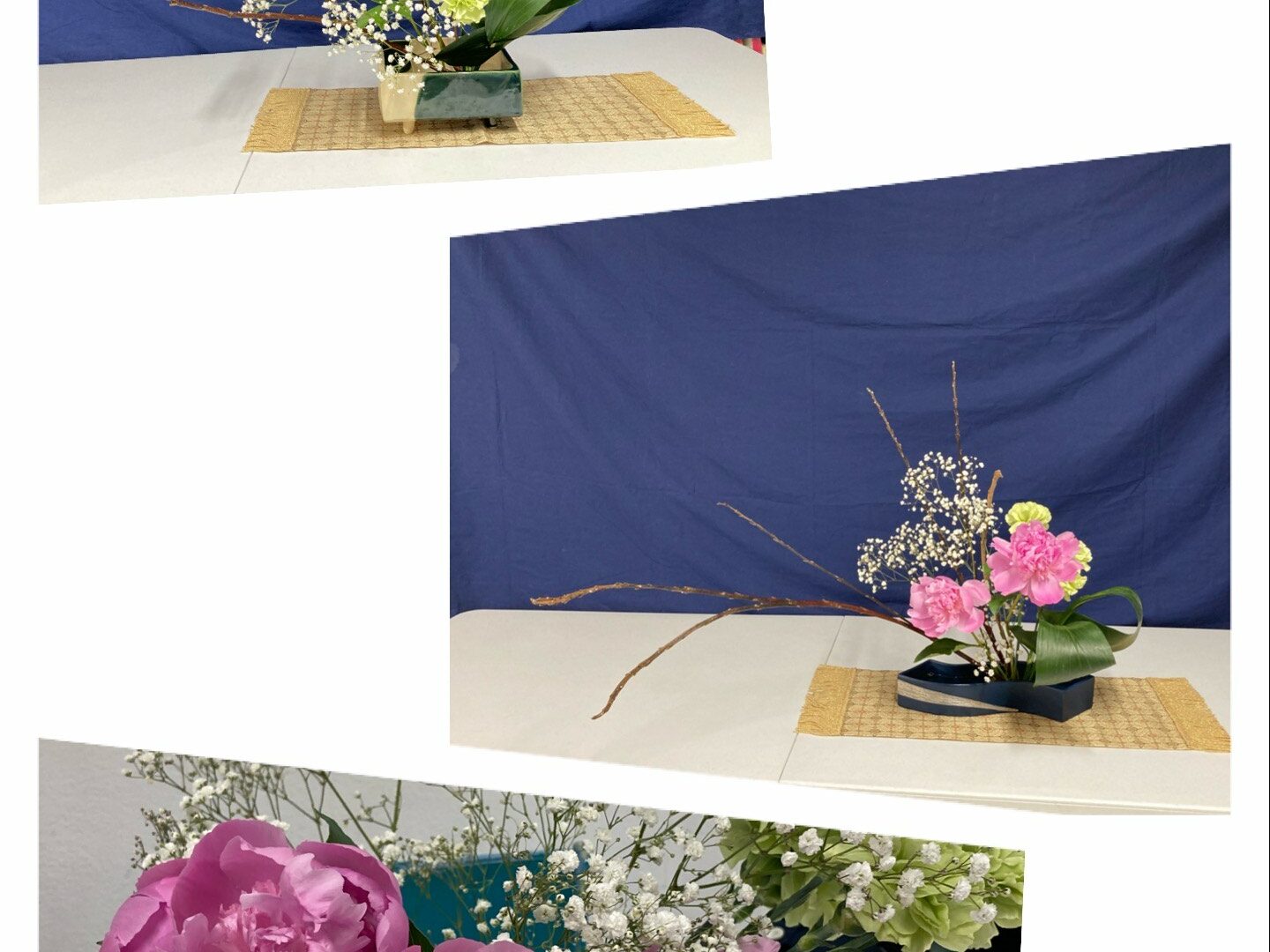 We used the branches of Japanese fantail willow for this lesson. Each branch has a unique form, and we tried to emphasize in those beautiful winding lines. As for the flowers, I prepared the peonies, carnations, and gypsophila. They made the floral compositions elegant.