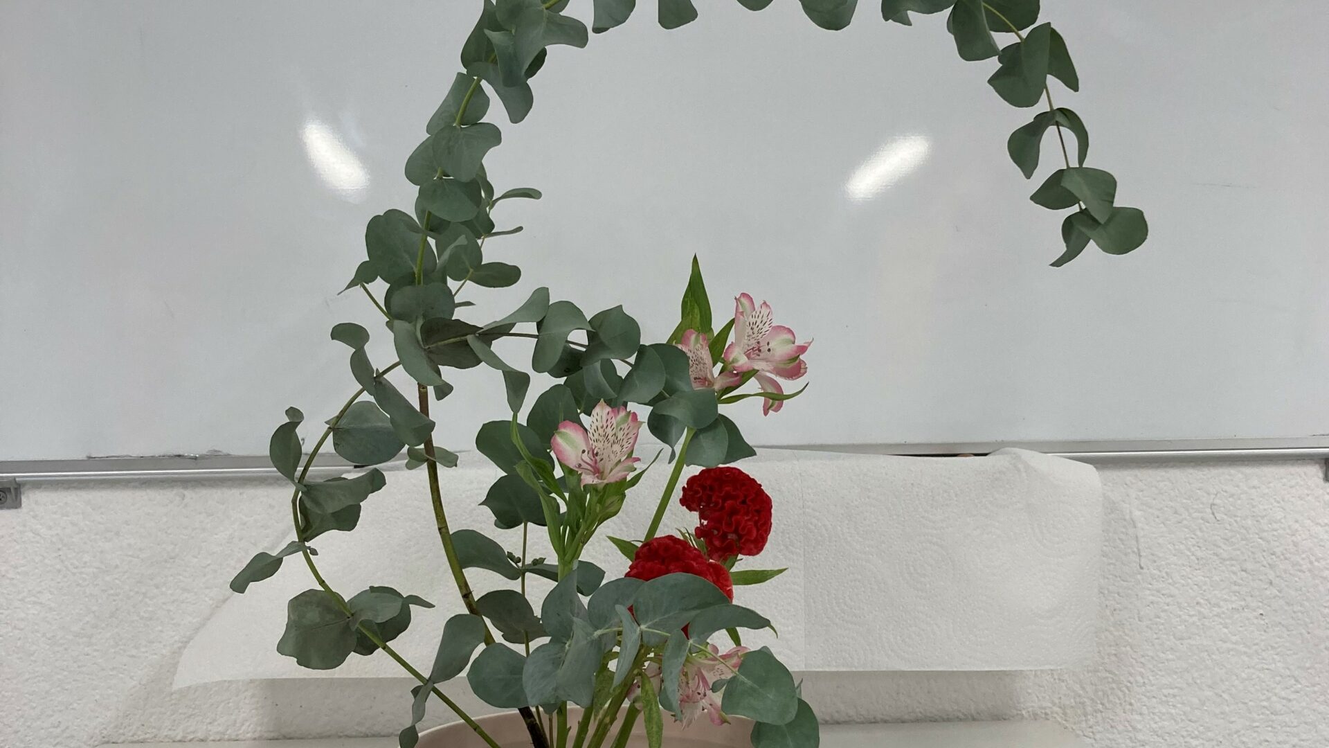 We practiced the particular form in which the energy flows to right side. The branches of eucalyptus have the flexibility to bend and change the forms, therefore we could realize this work which gave the dynamic impression.
