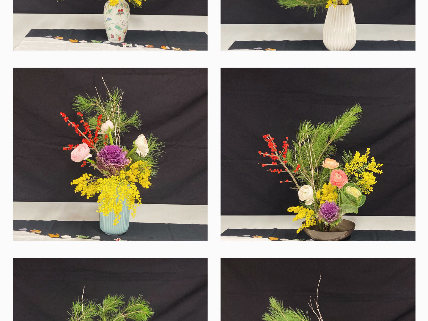 Nous avons étudié la forme Nageire en utilisant des vases hauts sans pique-fleurs. pour le niveau intermédiaire. Les compositions Nageire sont toujours plus compliqué pour bien fixer des fleurs parce qu’il y a pas de pique-fleur. Cependant les élèves ont bien réussi à réaliser leurs créations à la fin du cours.