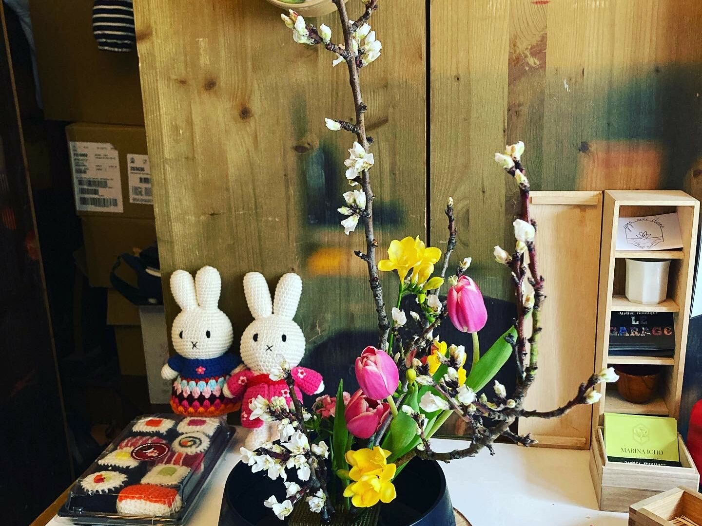 J’ai composé une création florale en utilisant des branches d’amandier cette semaine. Les fleurs d’amandier s’épanouissent partout à Montpellier maintenant, et ça me rappelle le printemps avec des cerisiers au Japon. J’espère que cette composition amènera l’air du printemps au restaurant.