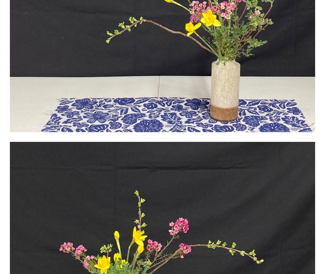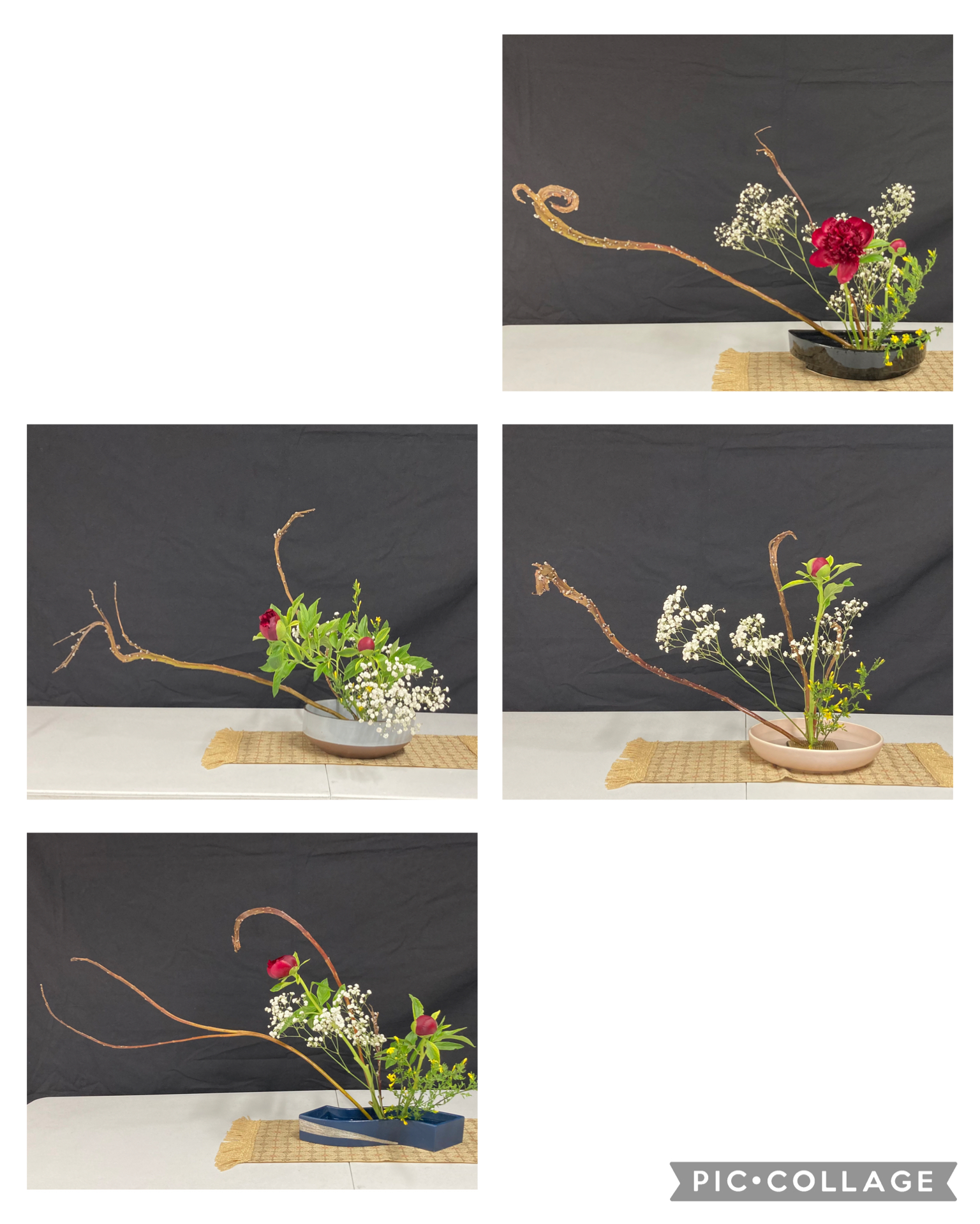 Nous avons étudié la forme en bas avec les vignes vierges. La couleur d’automne nous attire toujours lors de composer l’ikebana!