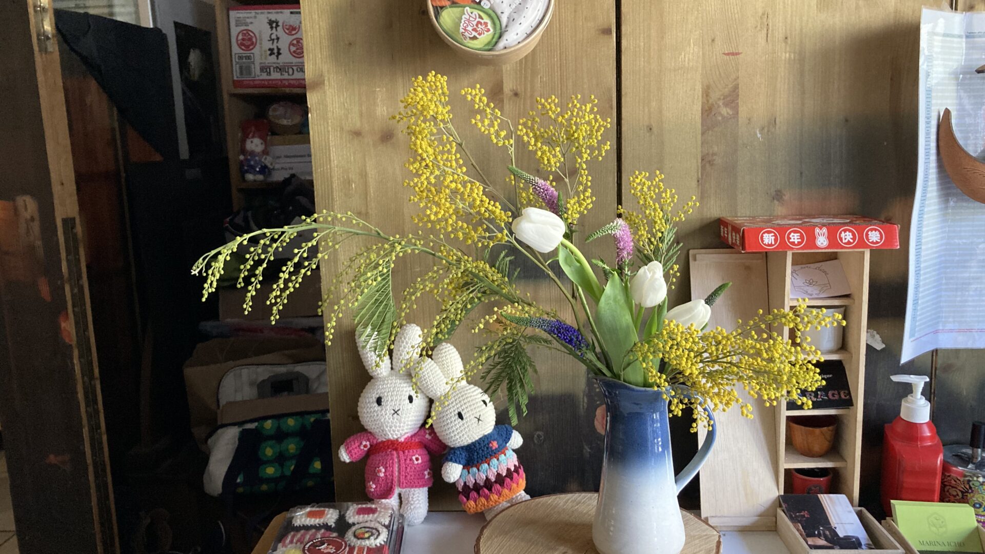 J’ai sélectionné des fleurs de mimosa pour cette semaine car c’est la saison de mimosa au Sud de la France. Ce que j’ai utilisé pour le continent des fleurs, c’est que un carafe artisanal à Montpellier. Je l’ai trouvé le magasin ‘ Pourquoi pas ?‘ auquel il y a plein de choix des vases.