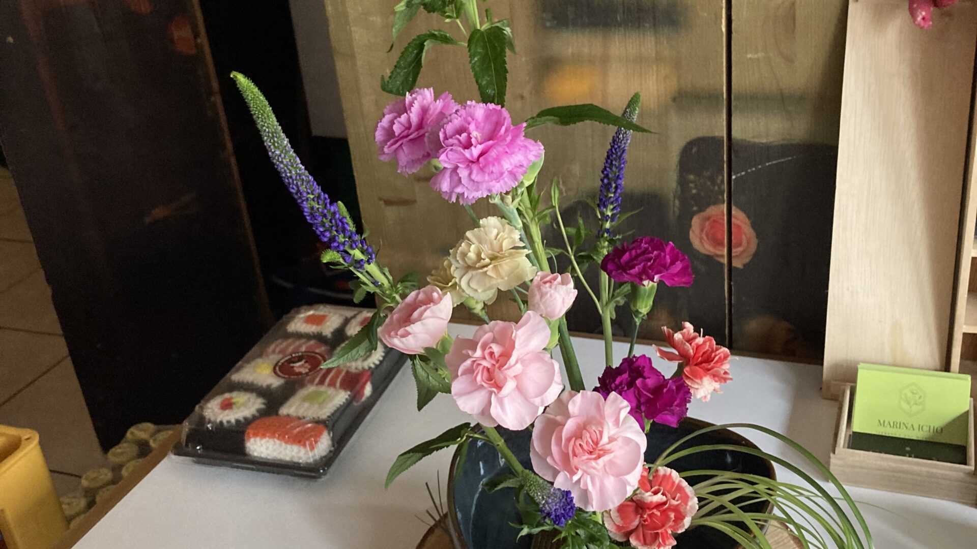Puisqu’il fait froid de canard cette semaine à Montpellier, j’aimerais composer une création florale qui nous apporte l’ambiance de printemps en hiver rigoureux. Ainsi, j’ai utilisé les fleurs de véronique dont la couleur est bleu foncé afin de symboliser l’hiver et des œillets colorées en tant que plein de floraison au printemps. J’espère que le