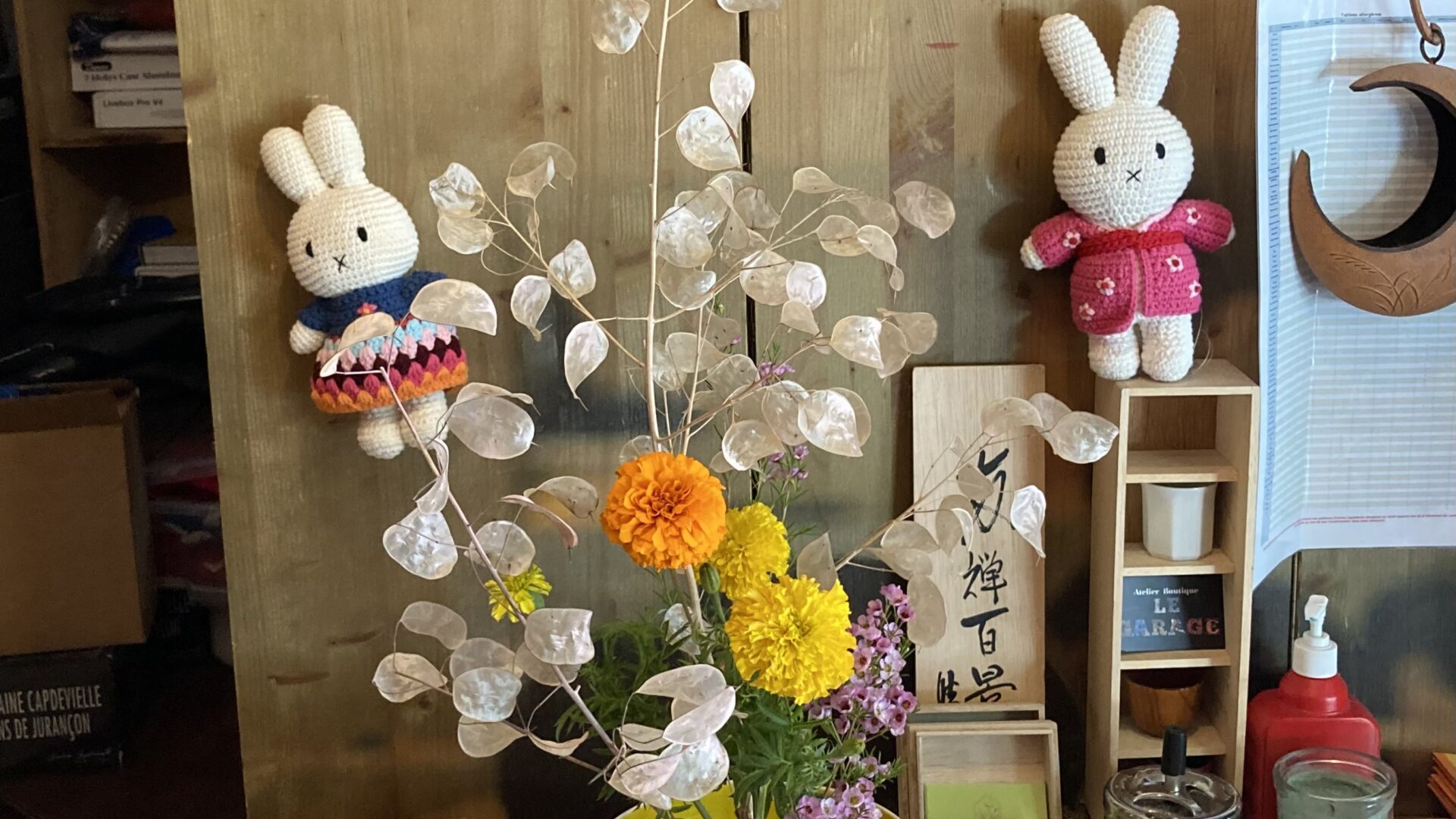 J’ai utilisé des branches séchées de monnaie du pape pour la création. Les feuilles de monnaie du pape brillent par la lumière du soleil et j’ai l’impression que elles sont encore vivantes. J’ai sélectionné des fleurs dont la couleur est claire comme des tagètes et des fleurs de cire pour contraster avec celle de monnaieContinue readingL’ikebana au Sushi-bar pour cette semaine